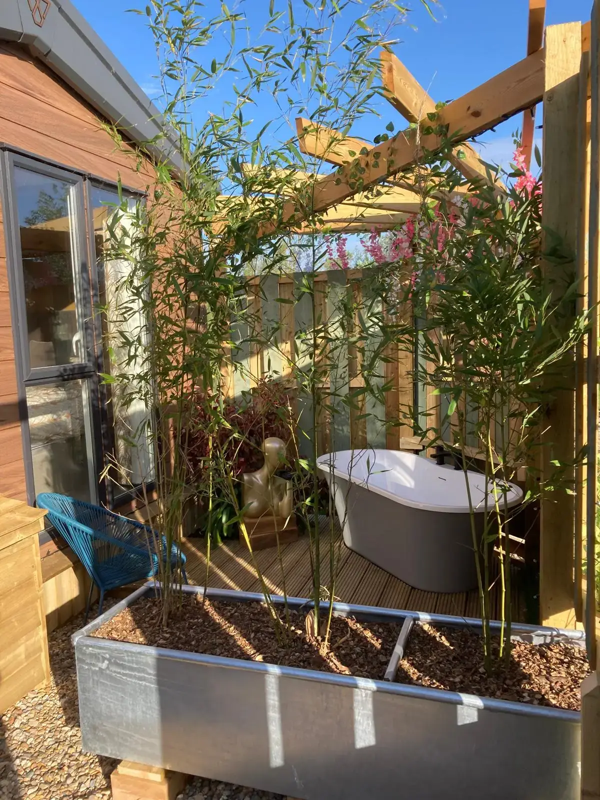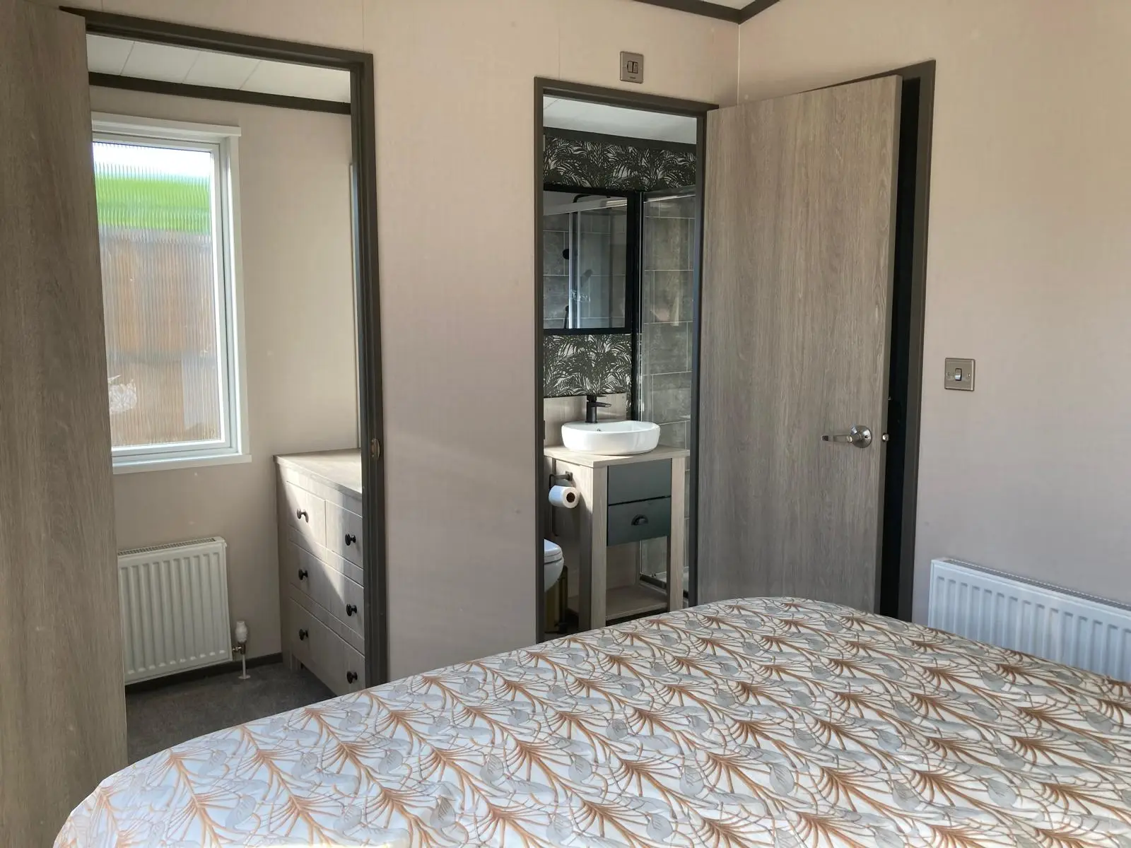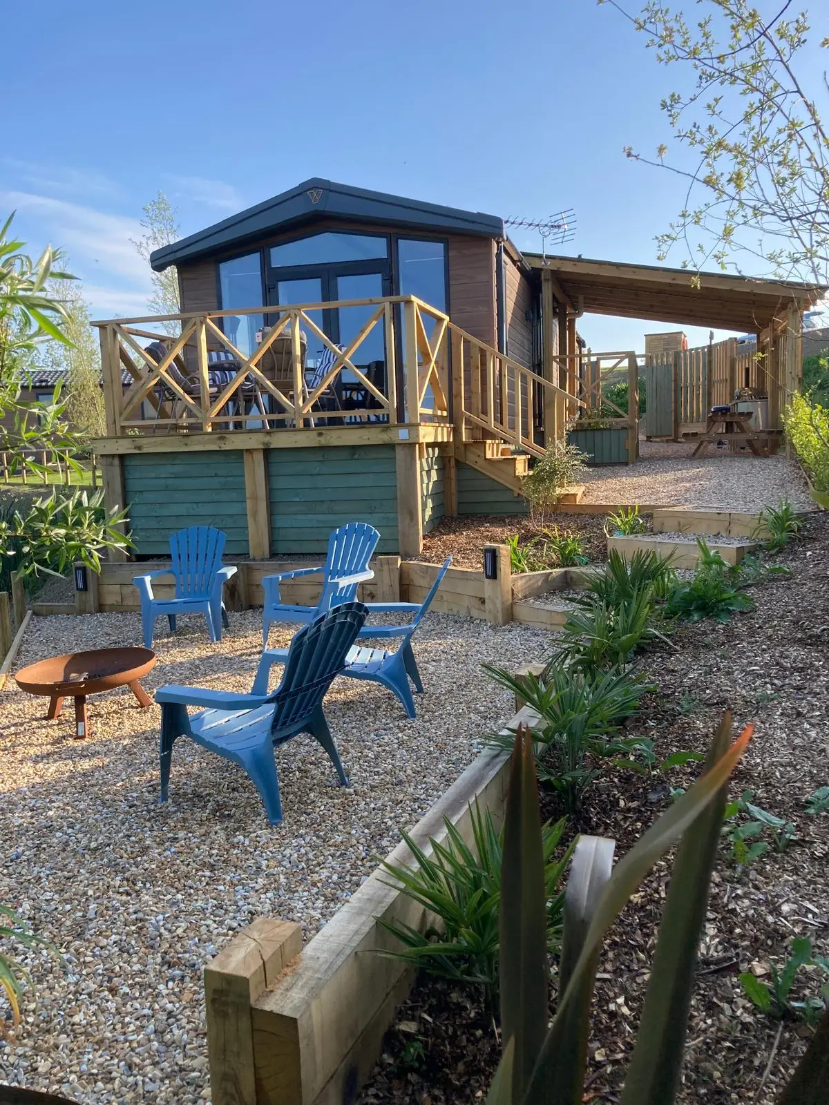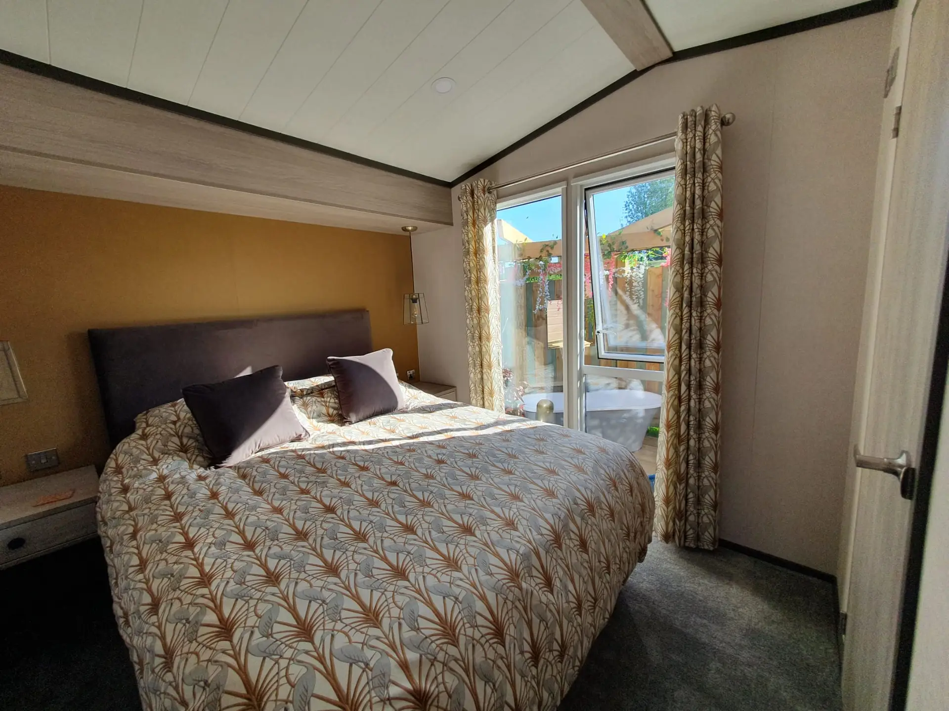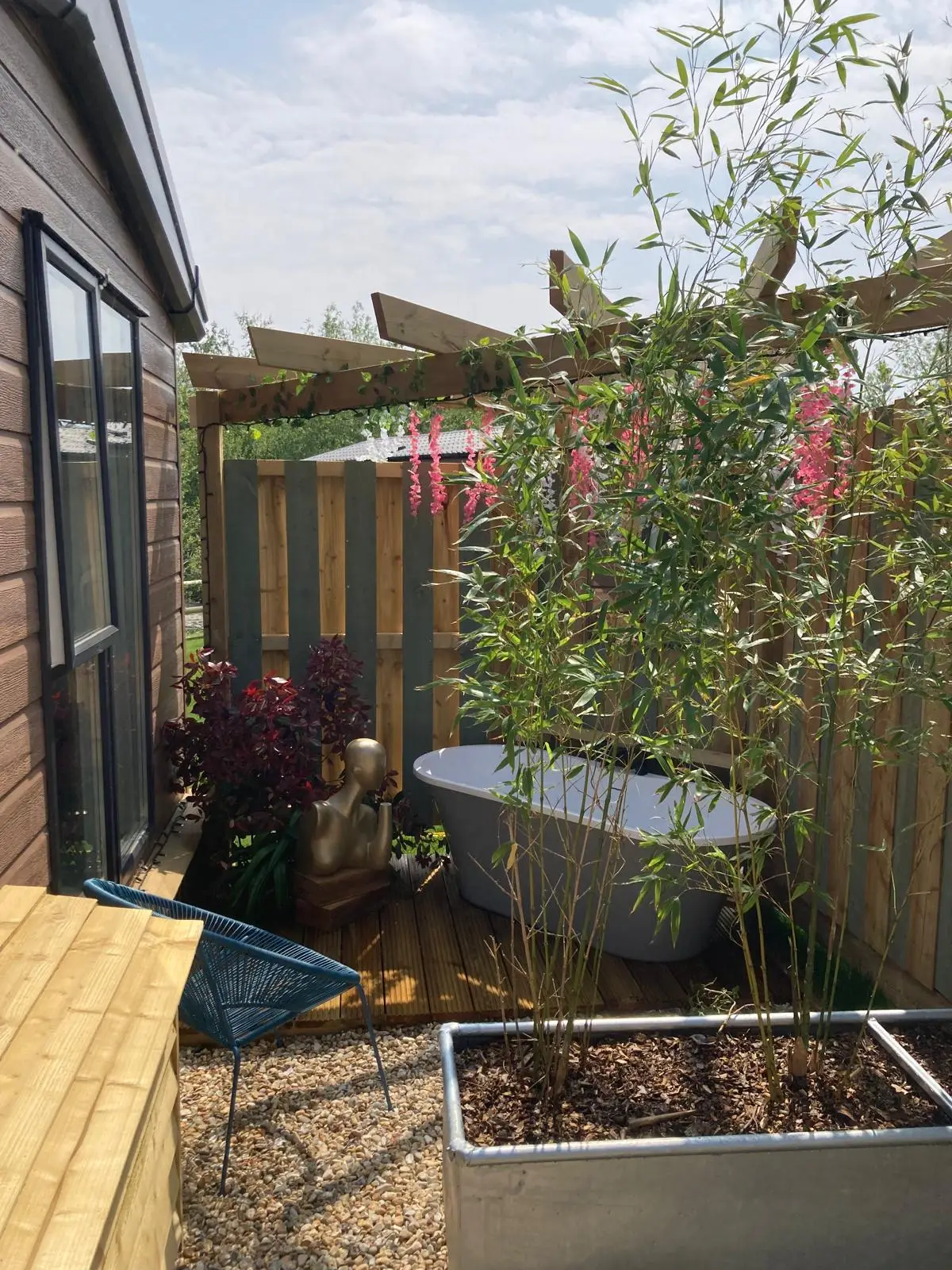 Romantic tones throughout. Views across the garden. Outside dining area with BBQ, fire pit and woodfired hot tub make this lodge the perfect retreat